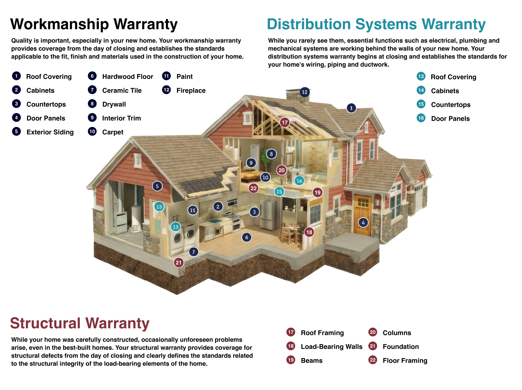 While your home was carefully constructed, occasionally unforeseen problems arise, even in the best-built homes. Your structural warranty provides coverage for structural defects from the day of closing and clearly defines the standards related to the structural integrity of the load-bearing elements of the home.